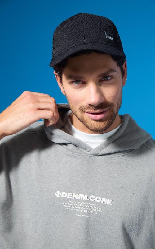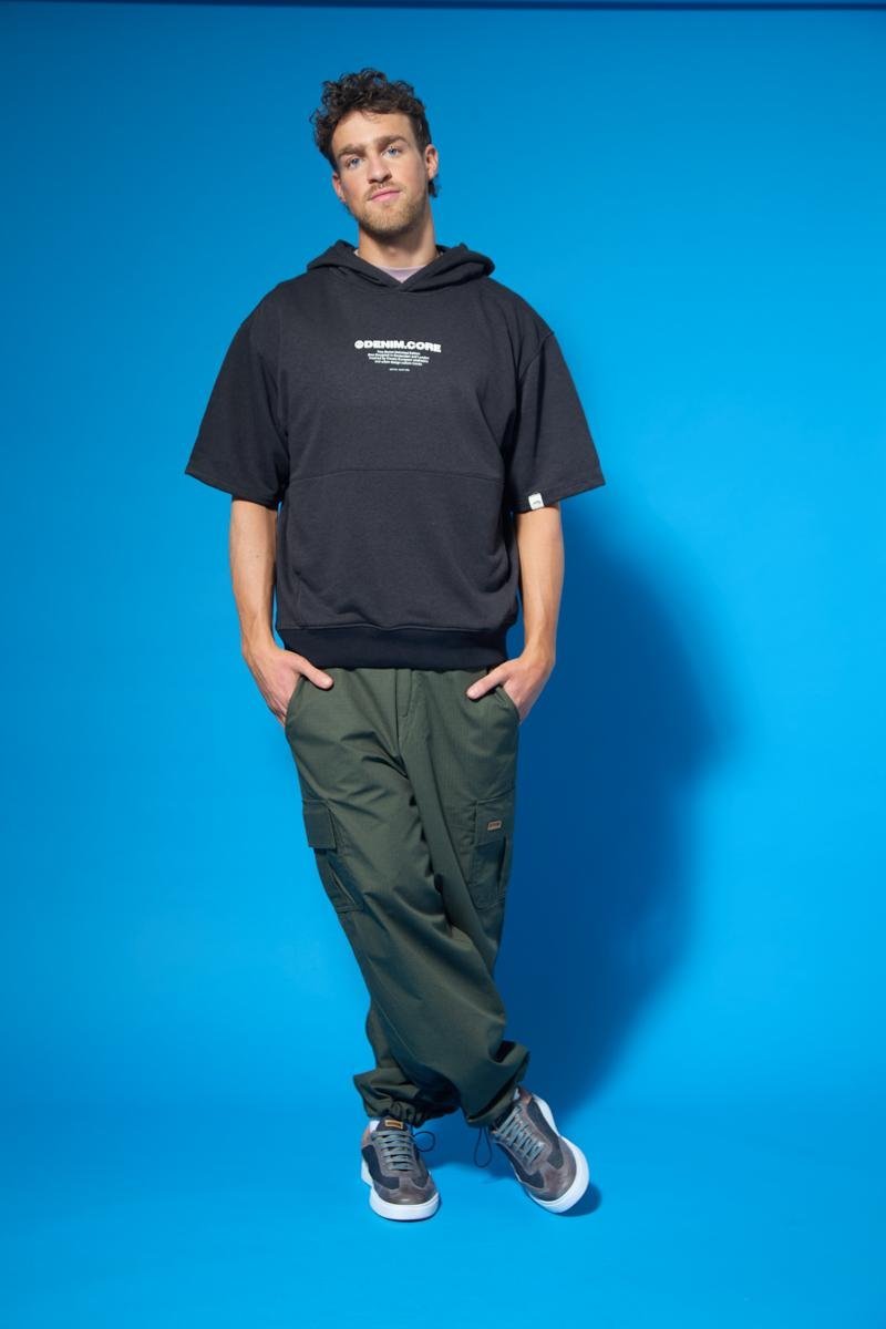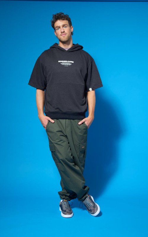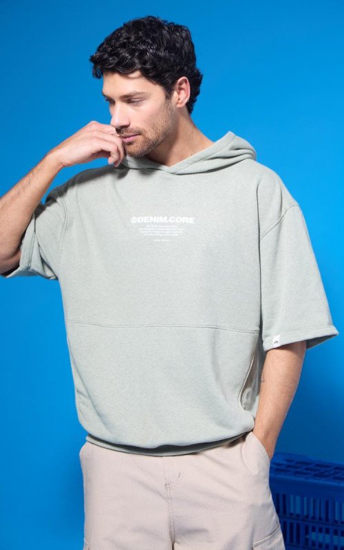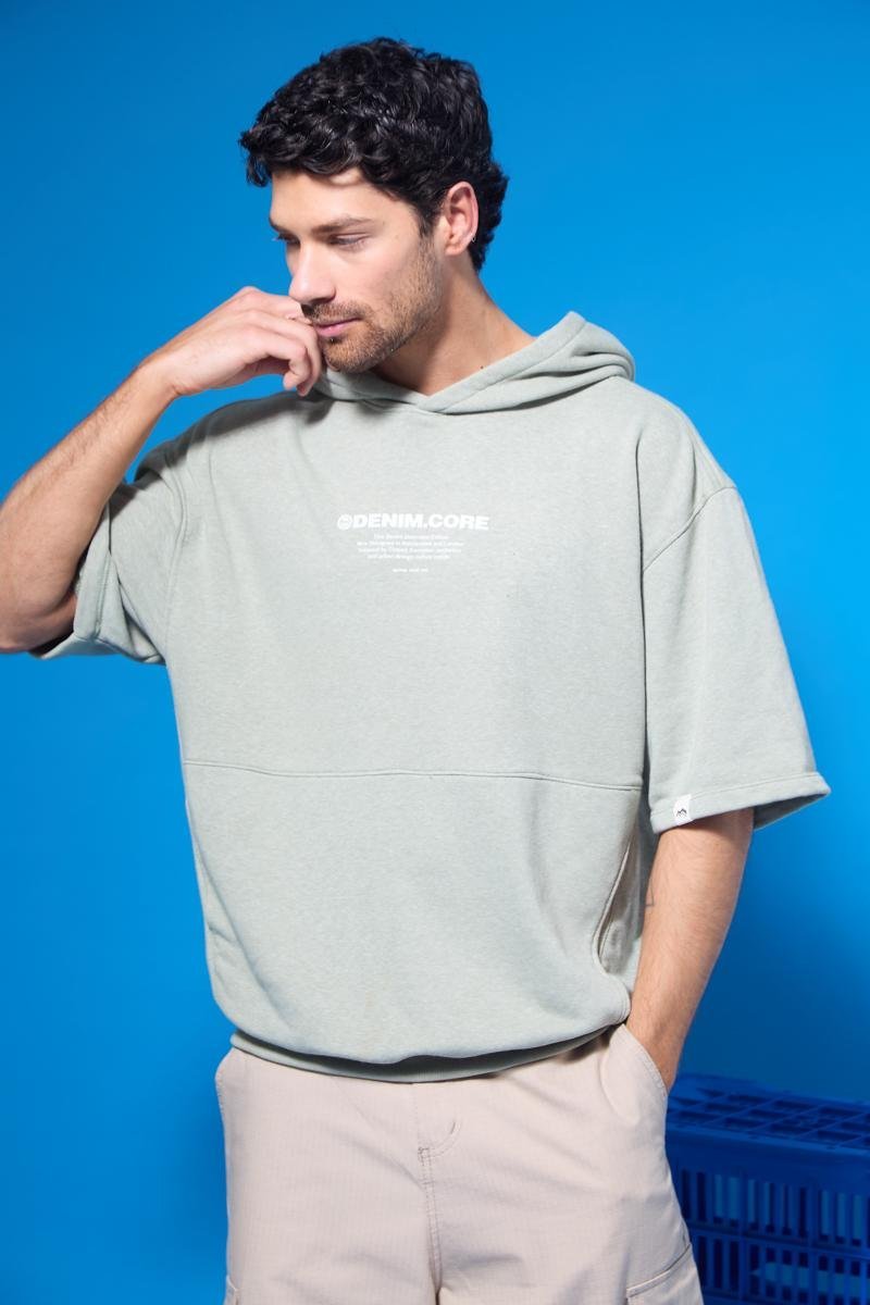 Rústico melange diagonal. Estampa en altura y bolsillo canguro. 100% poliéster.